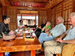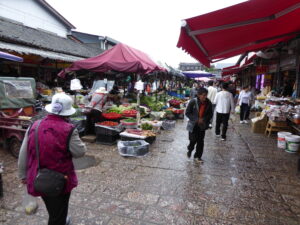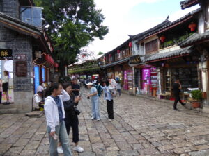 From Lugu our route included a side trip to Baoshan Stone village (lunch stop) to the ancient city of Lijiang, our furthest point south. A sign in Baoshan showed Tea Horse Road; long ago, Lijiang was a major centre of commerce and a start point for the trade taking tea to Tibet so this road was part of the old trade network. We had a rest day in Lijiang and the highlight of the day was a tea ceremony when we had a lengthy lecture on teas. This was followed by lunch and a trip to a monastery.