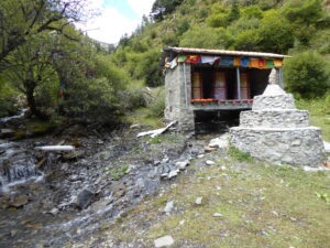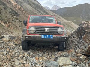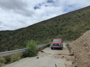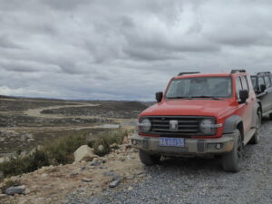 From Litang we continued in an at times bleak landscape, via another monastery whose name I’ve lost – it was on a detour off the planned route – to the Eye of Genie holy Mountain By explanation, Genie is the name of the holy mountain and its eye is the lake with the growth in the middle. It was planned that we should visit the local “yurt base” which I think was an outdoor shopping area – it was deserted so an easy choice to ignore it! Christina was travelling with me today and we were the only car to attempt the high altitude pass from the yurts towards Batang. It was a most unlikely track leading past the high pasture and nearly impassable – I did re-arrange the tank’s running boards in the transit but our insurance had no excess except for total loss!