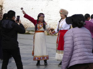 We carried on up winding steps past flat roofed, whitewashed buildings. The monastery was busy with visitors (probably all Tibetans apart from us) yet quiet and peaceful. Shoes were left at various points though it was often difficult to know which the correct places were – sometimes steps to upper floors seemed to be with and sometimes without shoes. Before leaving we had “butter tea” in the café, where we sat or squatted on low, cushioned plinths, without any formality of the “territoriality” that afflicts tables and chairs.