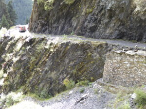 (to call it a road would be a misnomer) was very rough, unguarded steep sides, rocky, bumpy by turn sandy, always narrow with plenty of blind corners. Then we came to a junction (a signpost would make it too easy). Should we fork left and down or right and slightly up? Both looked so narrow that I decided it had to be a form f one way system. So as they drive on the left I headed left – Allison was not convinced and told me how difficult it would be to turn round – impossible actually. We continued, more from an act of faith on my part than anything logical. After a while we came up to a convoy of army vehicles, a jeep that soon vanished and two slow lorries