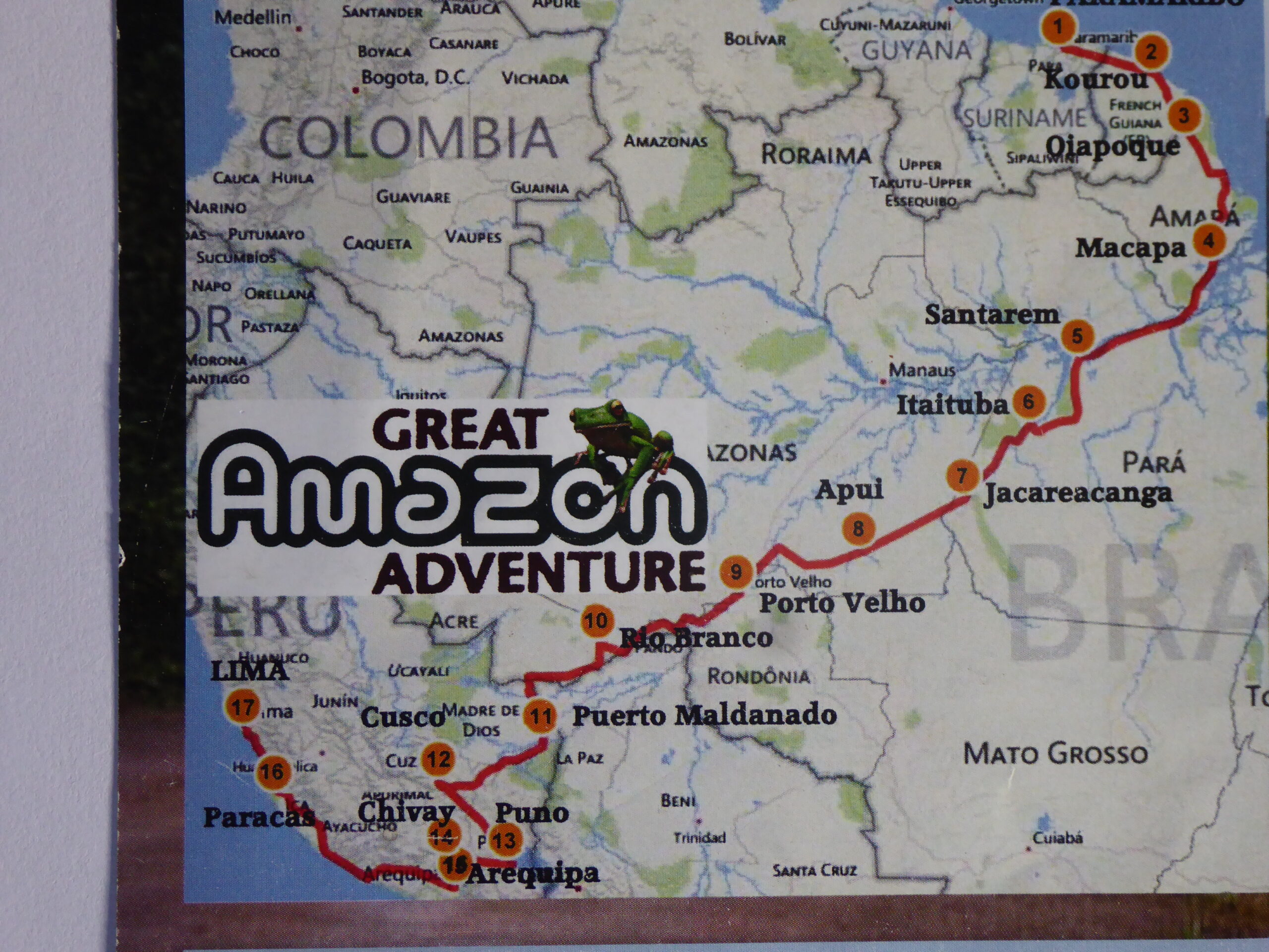 The journey starts in Paramaribo in Surinam, then on to French Guiana. We cross into Brazil and collect an Amazon river ferry from Macapa to Santarem. Then there’s some 2700 kms through Porto Velho and along the Amazon Highway to Puerto Maldanado and Peru. Next stops Cusco and Machu Piccu followed by 1900 kms to Lima, where we end.