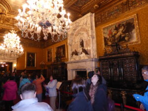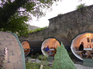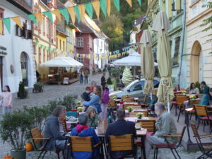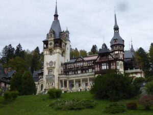 Then to the fairy tale 150 year old Peles Castle We had timed entry tickets but would have done better to wait 15 minutes before starting to avoid the crowds though we did manage to find some empty areas. and on to Brasov to a small hotel in the town centre where our travelling kettle blew the room’s fuses. But we did find a rather unusual pub nestling against the old City Walls .