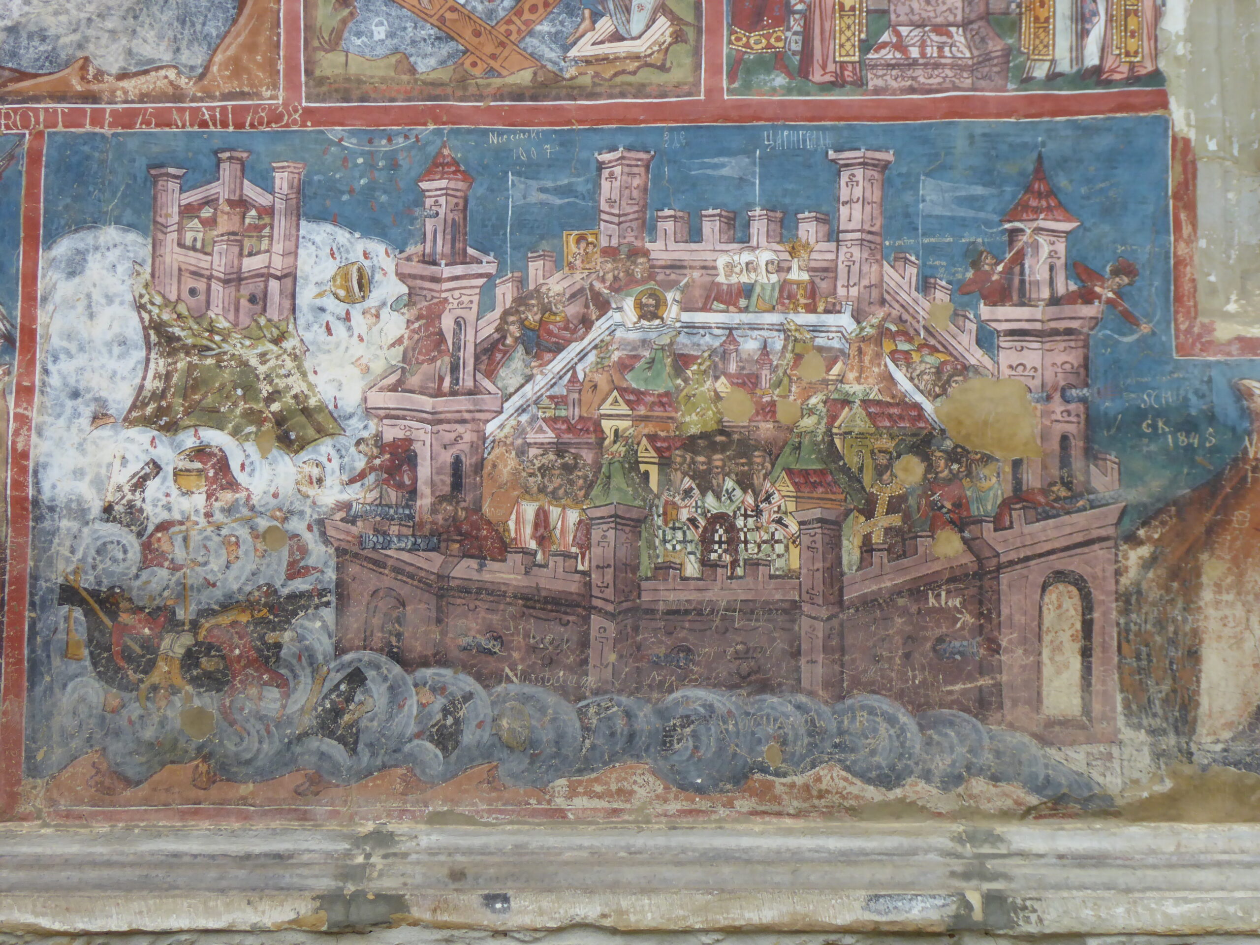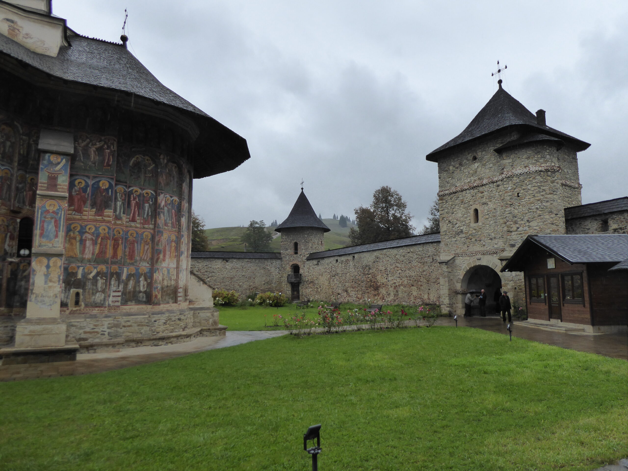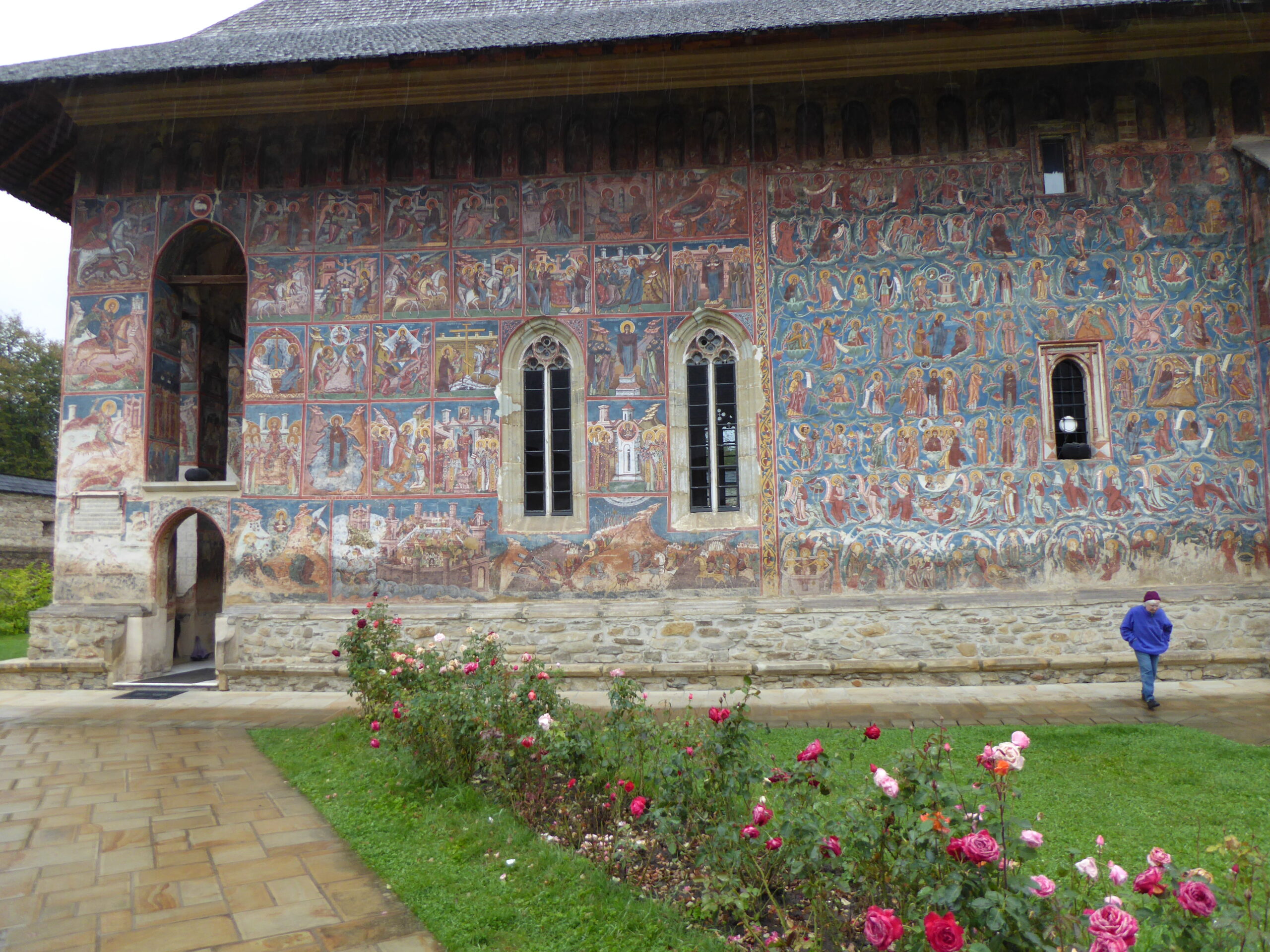 Day 4 and rain. Our first visit was better than expected – a studio of painted eggs. Inside there were cabinets of painted eggs in colour themes but each egg, and there must have been thousands, was slightly different – amazing! And on to the equally amazing Moldovita Monastery (1532) with its painted walls